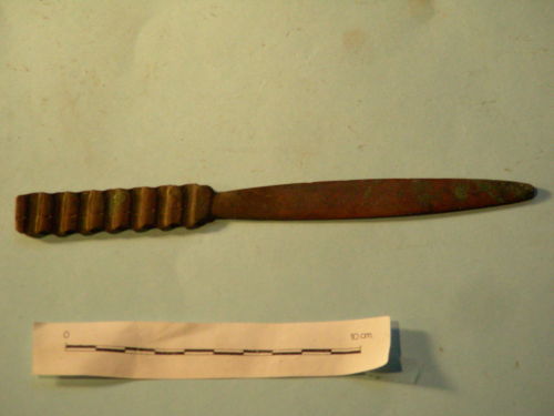 Lama dritta, punta arrotondata al centro, a due fili.