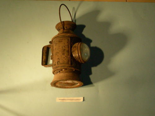 Corpo principale a cilindro, con base a tronco di cono, sportellino apribile, lente circolare e impugnatura sormontata da meccanismo di blocco della parte interna. All'interno, serbatoio con foro e rotella. Gabbia interna a tre finestre sormontata da calotta verniciata e coperchio con sei scanalature trangolari. Manico fisso, circolare, fissato con due rivetti per lato.