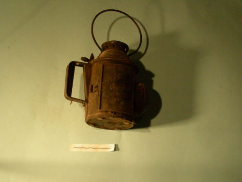 Corpo principale a cilindro, con sportellino apribile, lente circolare e impugnatura sormontata da meccanismo di blocco della parte interna. All'interno, serbatoio con foro e rotella. Gabbia interna a tre finestre sormontata da calotta. Manico fisso, circolare, trattenuto da due rivetti per lato.