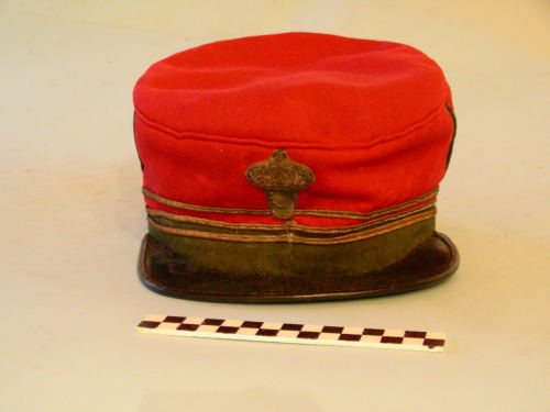 Corpo di foggia alta, circolare, in panno rosso, fascia verde sul bordo inferiore sormontata da 3 profilature dorate, visiera, fregio frontale in filo dorato, tre profili verdi verticali. Interno con fascia di tela cerata e fodera di colore ocra con righe nere con stemma.