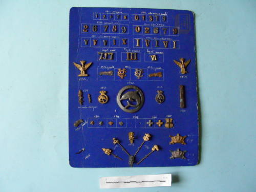 Pannello blu. Vi sono attaccati sessantuno fregi di cui quarantaquattro entro riquadri a penna a inchiostro bianco; la prima e la seconda fila sono composte rispettivamente da dieci fregi a forma di numeri arabi; la terza fila è composta da dieci numeri romani; la quarta fila è composta da tre fregi in numeri arabi e romani legati; la quinta fila è composta da due aquile coronate con scudo sabaudo, due profili di automobile e due lettere maiuscole intrecciate; la sesta fila è composta da due daghe contornate da foglie d'alloro, tre delfini in cerchio, di cui due coronati, un fascio di alloro; la settima fila è composta da un profilo di automobile, due stellette, due corone, due croci sabaude, uno scudo sabaudo; l'ultima fila è composta da quattro spille ad ago e due spille per bavero con stemmi militari vari e due corone sopra daghe incrociate.