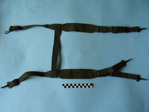 Due spallacci con doppio gancio a moschettone e doppia fettuccia regolabile a due estremità, e gancio singolo con fettuccia regolabile alle altre due estremità. Raccordo centrale cucito.