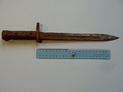 Lama dritta, con sguscio fino al controfilo su entrambi i lati. Guardia ad anello. Impugnatura con sistema di aggancio a pulsante; guancette con spinotto passante.