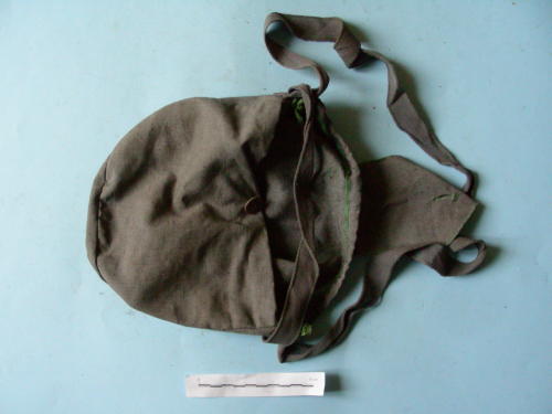 A sacca, con fettuccia di trasporto, tracolla e patta di chiusura a bottone ad asola. Cordino passante di colore verde per la chiusura della tasca. Taschino laterale all'interno.