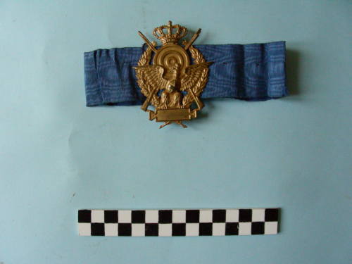 nastro in stoffa di colore blu, con fascia elastica all'interno e spilla di sicurezza per la regolazione all'esterno. La fascia da braccio è decorata con lo stemma del Tiro a Segno Nazionale: due fucili incrociati su corona di quercia (ramo sinistro) e alloro (ramo destro), coperti parzialmente da un bersaglio circolare sormontato da corona; in primo piano aquila coronata stante su tabella ansata, ad ali spiegate, che porta sul petto lo stemma sabaudo.