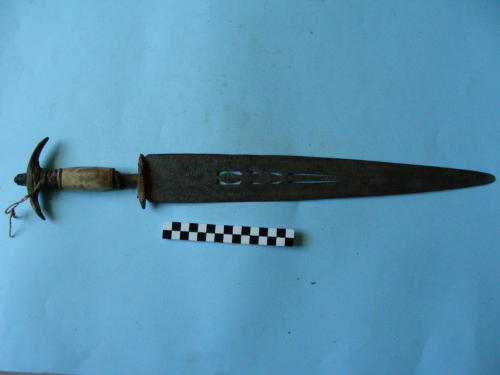 Lama piuttosto larga, a due fili; al centro è ricavata a traforo una lucertola stilizzata, le cui squame sono rese da unincisione a linee incrociate; i fili sono messi in risalto da una sottile incisione, tutto intorno. Sul resto della lama sono presenti decorazioni incise, a semplici motivi geometrici. Tipica impugnatura berbera; vicino al tallone è inserita una guardia a crociera, in corno; di seguito anelli in corno; la parte centrale è in osso, seguono altri anelli in corno; prima del bottone è inserita una mezzaluna di corno tipica. Il bottone è fatto con una piccola lamina di ferro avvolta sullestremità del codolo.