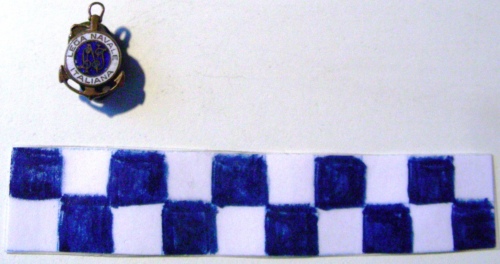 A forma di ancora dorata sormontata da un disco con cornice bianca con iscrizione dorata. Al centro in campo blu un monogramma dorato. Sul verso, fermaglio a forma di goccia rovesciata ed iscrizione.