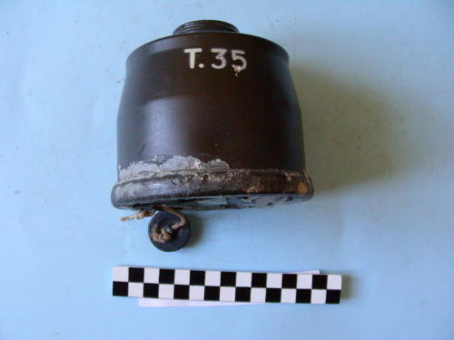 A base circolare, a forma di tronco di cono con apice cilindrico e filettato. Tappo circolare legato alla base; stelle a cinque punte in rilievo sul tappo e ai due lati dell'apice. Verniciatura color marrone