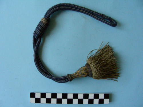 Con cordoncino annodato a metà, a righe alternate turchine e dorate; nappa a losanghe dorate e frangia dorata.
