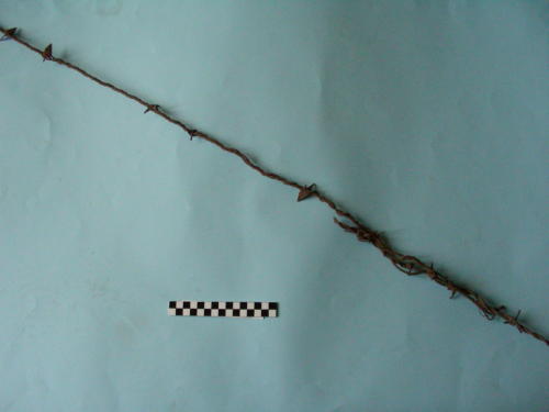 Corda a due fili ritorti con quattro triboli a quattro punte con unito segmento di corda a tre fili ritorti con cinque spine tagliate a formare tre punte.
