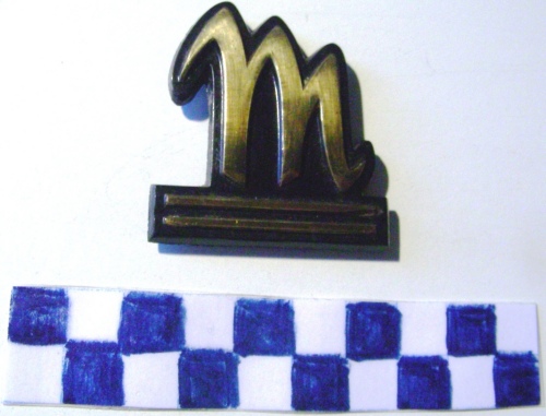 Su una base stilizzata di colore nero monogramma dorato con 2 barre orrizzontali sottostanti. Sul verso, quattro perni per il fissaggio ed iscrizione.