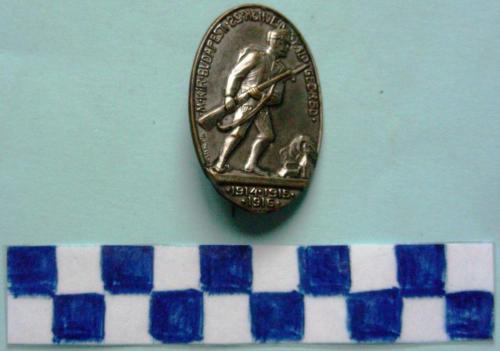 Di forma ovale con al centro in rilievo verso destra un soldato in marcia che impugna un fucile. In basso a destra, un villaggio stilizzato con nubi sovrastanti. Iscrizione sulla corona nella parte superiore e nella parte inferiore. Sul verso spilla per il fissaggio.