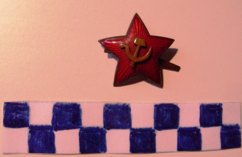 A forma di stella a cinque punte di colore rosso scuro, raggiante dal centro e falce e martello dorati in rilievo. Sul verso spilli di fissaggio.