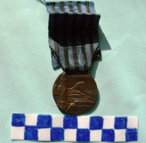 Disco di metallo, sul dritto il ritratto di Vittorio Emanuele III rivolto verso sinistra col capo scoperto, il tutto attorniato da una legenda. Sul verso è raffigurato uno scenario nordafricano con monti e deserto affiancato sulla sinistra da un fascio littorio. Scritte in alto e sotto lo scenario. Nastrino con 6 strisce blu intervallate a 5 strisce nere.