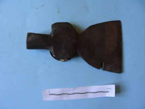 Presenti la lama, il martello di forma ovale appiattita ed una parte del manico, incastrato nella gorbia.