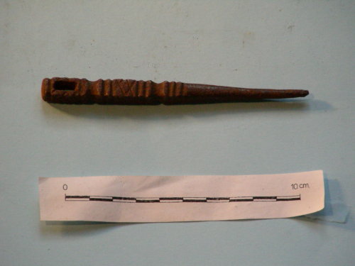 Dritto, a sezione quadrata. Impugnatura incisa a motivi geometrici con asola all'estremità. Punta squadrata.