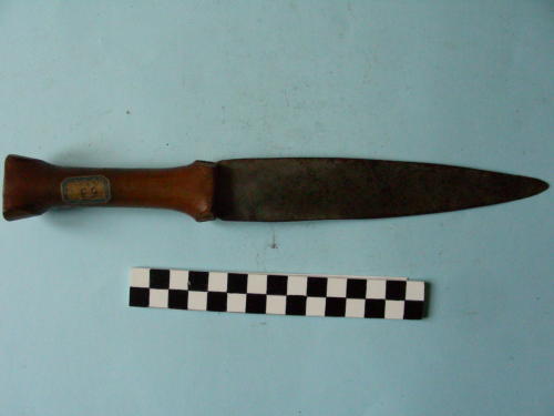 lama diritta, lanceolata, simmetrica, fucinata a mano, affilata ai bordi fino alla punta, molto acuminata. Impugnatura lavorata a mano, senza eccessive rifiniture. Ha la forma tipica etiope: larga alla guardia e alla coccia, assottigliata al centro. Per consentire di ribattere lestremità del codolo, molto più corto dellimpugnatura, è stato praticato un incavo semicircolare alla coccia. Guardia appena accennata, ricavata dallimpugnatura stessa.