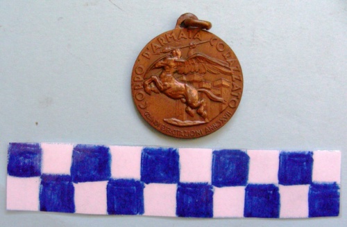 Disco di metallo, sul dritto in rilievo centauro alato rampante volto a sinistra nell'atto di scagliare una lancia, in secondo piano un castello, iscrizioni sulla corona. Verso in rilievo diviso in 4 quadranti da un fascio littorio verticale ed una linea orizzontale con sottostanti nodi Savoia. Nei quadranti superiori a sinistra il Castello di San Giusto, a destra il Castello del Buonconsiglio. Nei quadranti inferiori a sinistra un ariete rampante, a destra un'iscrizione. Ulteriore iscrizione sulla corona con serto d'alloro.