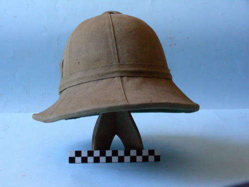Calotta a sei sezioni sormontata da calottino in lamiera con tre fori di aerazione; tesa larga; due fori di aerazione laterale. Fascia posta sopra la tesa, fissata attraverso un passante. Taschino in posizione laterale. Di color kaki, rivestimento interno color verde.