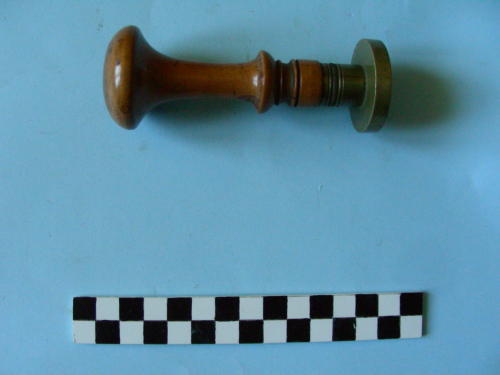 timbro ad impressione formato da due elementi separati e lievemente decorati con scanalature; la parte metallica presenta, su un lato, una freccia (indicazione del "dritto").