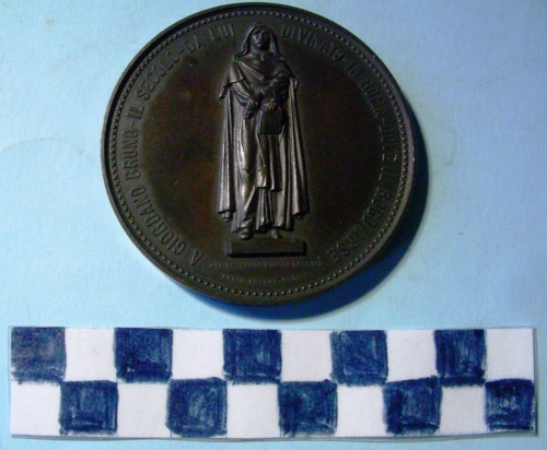 Di forma circolare, Sul recto, al centro, in rilievo la rappresentazione del monumento a Giordano Bruno posto in Campo dei Fiori a Roma. Iscrizioni lungo la corona e sotto la figura. Sul verso, iscrizione al centro entro corona di fiori, croci ed ovali.