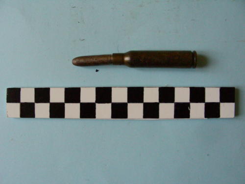 Di forma cilindrica, con fondello e restringimento all'apice del bossolo e proiettile conico.