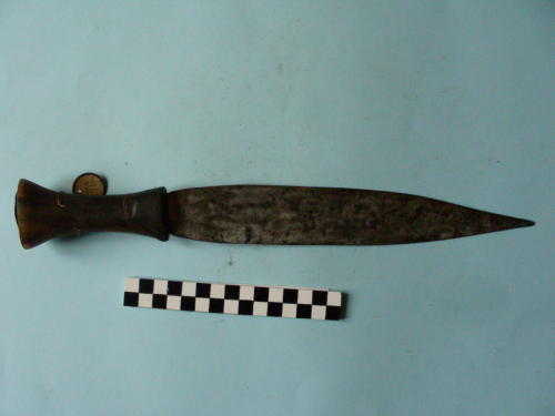 lama diritta, lanceolata, simmetrica, fucinata a mano, affilata ai bordi fino alla punta, molto acuminata. Non ha decorazioni. Impugnatura in corno lavorato a mano, senza eccessive rifiniture. Ha la forma tipica etiope: larga alla guardia e alla coccia, assottigliata al centro. Il codolo è ribattuto su una semplice rondella non decorata.