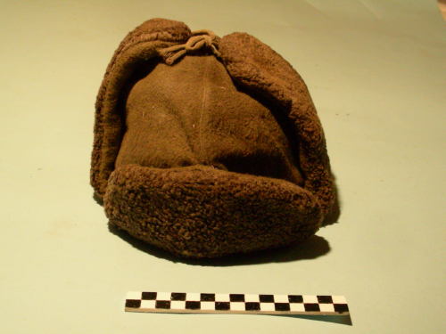 A calotta circolare, paraorecchie laterali terminanti con legaccio per il fissaggio superiore. Visiera ripiegata e cucita sulla fronte. Paraorecchie e visiera rivestite di finta pelliccia. Imbottitura trapuntata interna sulla calotta e pareti laterali rivestita di tela e fissata da cuciture a disegni geometrici.