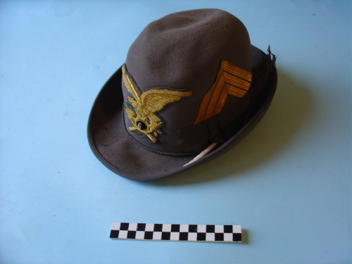 A tronco di cono, con cupola bombata e tesa larga, ripiegata all'esterno sui lati e sul retro e bordata. Cordellino intrecciato e fascia posti sopra la tesa, con penna scura infilata all'interno di un passante sulla fascia. Fregio frontale, e gradi di Capitano sul lato sinistro. Colore grigio verde militare; interno foderato di colore bianco.