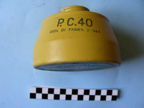 Corpo a tronco di cono, con cilindro filettato all'apice contornato da guarnizione e chiuso da coperchio avvitato. Due stellette in rilievo ai lati del coperchio. Disco removibile alla base, con linguetta di color rosso. Verniciatura color giallo.