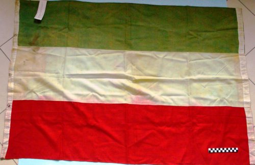 tricolore a sviluppo verticale, due bande di rinforzo sui lati corti, 5 anelli di fissaggio cuciti su una banda di rinforzo.