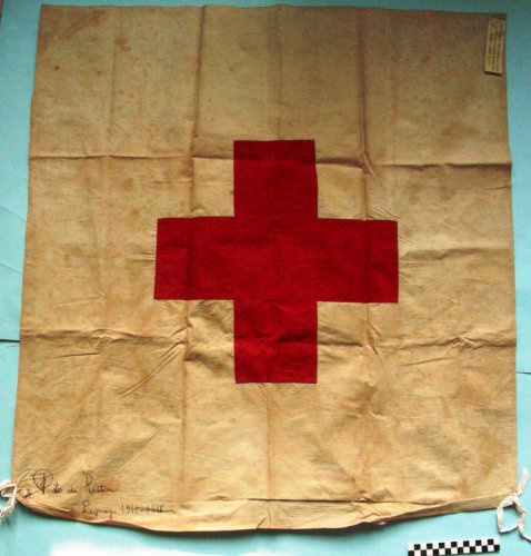 Drappo bianco con al centro, cucita, una croce rossa a bracci uguali. Quattro fettucce bianche per il fissaggio cucite su di un lato.