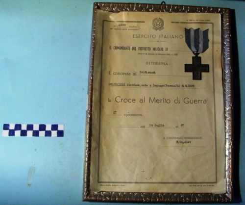 Di forma rettangolare, con cornice argentata decorata ad intarsi. Diploma entro bordo lungo il perimetro con emblema centrale nella parte superiore e croce incollata in alto a sinistra. La decorazione è costituita da una croce greca con iscrizione, sui due bracci orizzontali. Sui bracci verticali si trova, in alto il monogramma della Repubblica Italiana. In basso si trova invece un gladio romano invaso di foglie d'alloro. Sul verso, raffigura in centro una stella a cinque punte raggiante sulle braccia della croce. Il nastrino è azzurro con due strisce bianche centrali separate.