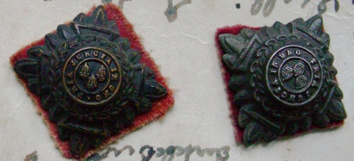 A forma tronco conica con base quadrata su panno di colore rosso. Decorato a motivi floreali e foglie d'alloro, con scritta circolare e stemma alla sommità. Sotto la base due occhielli per il fissaggio alla controspallina.