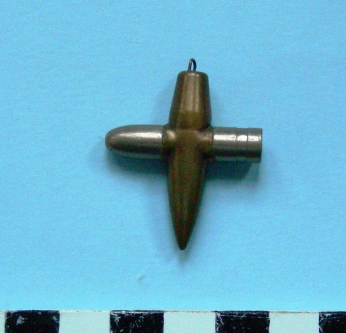 Due proiettili di calibro e materiale diversi compenetrati e saldati a formare una croce. Piccola maglietta per la catenella.