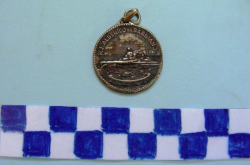 Disco argentato di forma leggermente irregolare. Sul dritto in rilievo il profilo di Alberico da Barbiano volto a sinistra con elmo decorato e con sovrapposto un drago, iscrizione lungo la corona. Sul verso, al centro ed in rilievo, un incrociatore che solca il mare verso sinistra, sotto la nave un cartiglio con iscrizione. Ulteriore iscrizione lungo la metà superiore della corona. Sono presenti una maglietta ed un anello di fissaggio.