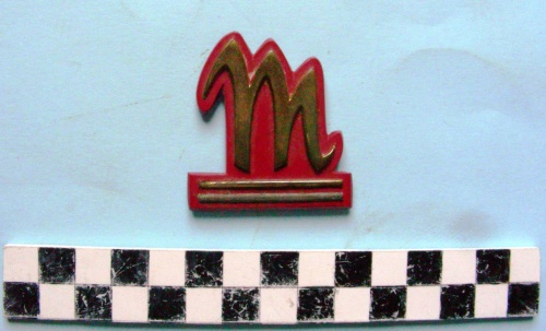 Su una base stilizzata di colore rosso monogramma dorato con 2 barre orrizzontali sottostanti. Sulla faccia posteriore quattro perni per il fissaggio.