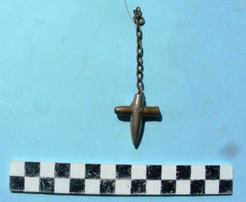 Due proiettili di calibro e materiale diversi compenetrati e saldati a formare una croce. Piccola maglietta con catenella al vertice.