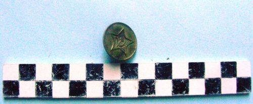 Disco metallico con simbolo al centro. Maglietta al centro della parte posteriore.
