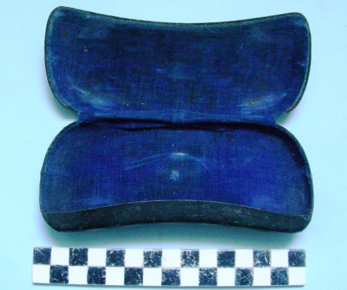 Contenitore a forma di parallelepipedo con angoli arrotondati e faccia inferiore concava. Faccia superiore a formare il coperchio incernierato sul lato superiore. All'esterno rivestito di tela nera, all'interno di panno di velluto blu.