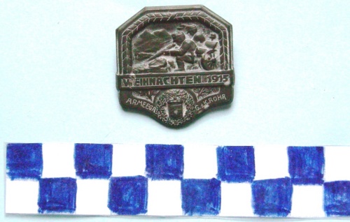 A forma di ottagono con lati inferiori arrotondati. Nella parte superiore, in rilievo, gruppo di fucilieri con cannone che sparano verso il basso. Sullo sfondo, paesaggio montano. Nella parte inferiore, in rilievo, lo stemma della Carinzia. Iscrizoni sotto la figura e lungo il lato inferiore. Sul verso, spilla di fissaggio.