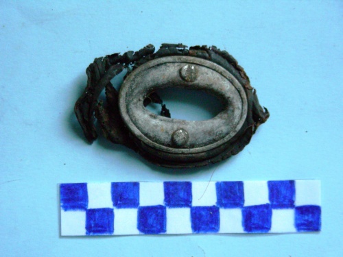 Doppio anello di forma ellittica aperto lungo la circonferenza per contenere una guarnizione di pelle. Due borchie laterali di fissaggio.