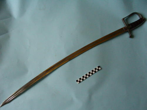 standard militare; lama curva, a filo, punta e controfilo. Sgusciature sui due lati per i primi tre quarti; per l'ultimo quarto due sgusci al centro per la lunghezza del controfilo. Punta ribassata alla pandura. Fregi ad acido a motivi floreali e militari su entrambi i lati della lama per la prima metà e sul dorso. Guardia a staffa ad un solo ramo; ramo di parata a riccio con spacco per dragona; alette fermafodero rettangolari; cappetta lunga con dorso sfaccettato. Tipico bottone ottagonale avvitato al codolo. Impugnatura a settori zigrinati separati da cinque scanalature.