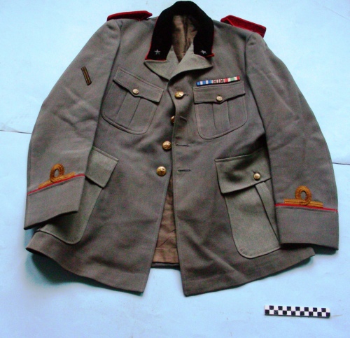 In cordellino grigio-verde, Due tasche applicate ai lati e due taschini al petto completi di bottoncini dorati portanti in rilievo trofeo dell'Arma. Chiusura verticale tramite 4 bottoni dorati portanti lo stesso trofeo ed asole. Paramani profilati in rosso e guarniti da galloni dorati, losanga, indicante il grado di Sottotenente. Spalline e bottoncini dorati, con trofeo d'arma , bordo e parte inferiore di panno rosso fissati alle spalle tramite passanti in filo cucito. Colletto di velluto nero bordato di rosso con 2 stellette a cinque punte. Nastrini del medagliere applicati al petto sul lato sinistro. Bandella per ferita in guerra in canottiglia dorata cucita diagonalmente sul braccio destro. Spacco posteriore chiuso da automatico. All'interno fodera con imbottitura trapuntata a motivi diversi sul petto ed ascelle.