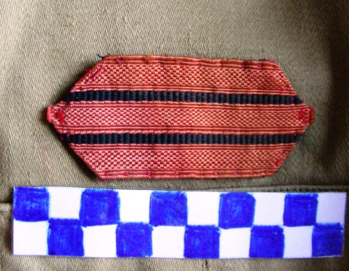 Esagono allungato di tela ricamata rossa e due strisce parallele di colore nero.