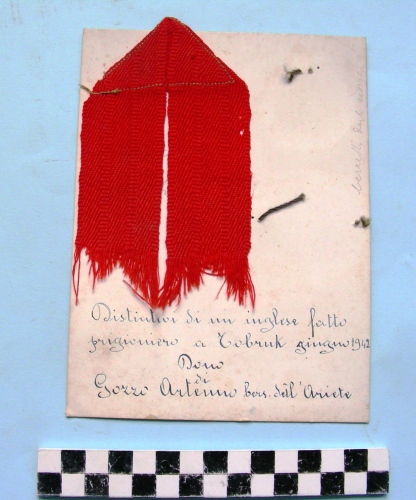 Nastro di colore rosso, ripiegato al centro e cucito a formare un triangolo.