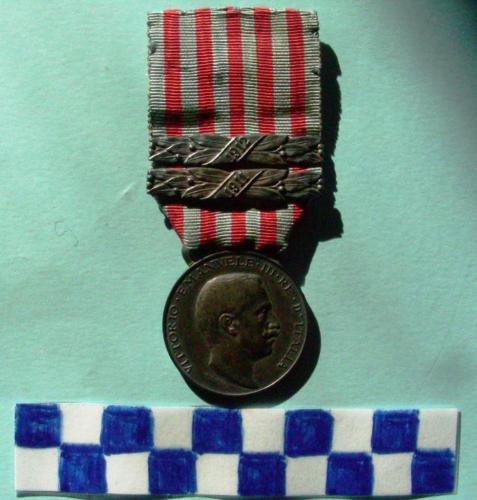 Disco argentato recante sul dritto il voto di Emanuele III rivolto verso destra attorniato da scritte. Sul verso scritta centrale attorniata da due rami d'alloro. Il nastro è composto da sei strisce blu alternate a cinque strisce rosso cupo. Sul nastrodue barrette bronzee decorate a motivi floreali con data per gli anni di prestato servizio.