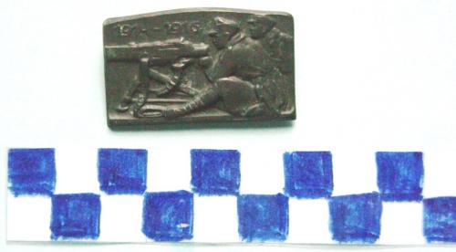A forma di rettangolo. Al centro, in rilievo, a sinistra un mitragliere ed un servente alla sua destra nell'atto di sparare una mitragliatrice Schwarzlose. Iscrizioni sui lati superiore ed inferiore a sinistra. Sul verso, spilla di fissaggio ed iscrizione.