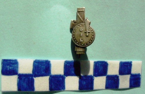 Scudo con borchie lungo la corona, una daga rivolta verso l'alto, sporgente oltre lo scudo sul lato destro, iscrizione verticale sul lato sinistro, il tutto sovrapposto ad un fascio littorio. Sul verso una spilla di sicurezza per il fissaggio.