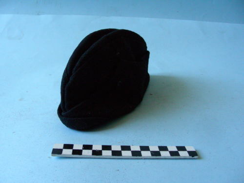 Floscia, con bordo ripiegato verso l'alto e di altezza degradante sulla nuca. Calotta a losanga con piega centrale. Interno con striscia di stoffa.